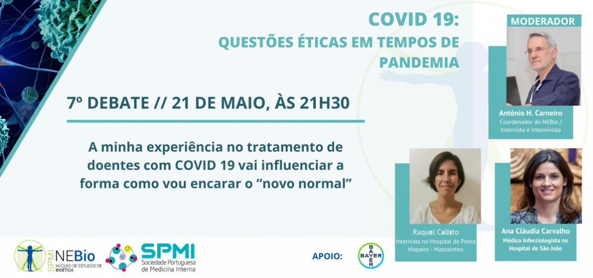 Os debates prévios promovidos pelo NEBio (Núcleo de Estudos de Bioética da Sociedade Portuguesa de Medicina Interna) tiveram boa aceitação pelo que vamos organizar mais cinco, desta vez com dois interlocutores. Os debates serão centrados nos desafios éticos, pessoais e profissionais que o “novo normal” nos coloca. A conversa partirá, da perceção que os preletores têm dos desafios que se avizinham, com base nas reflexões que fizeram sobre a sua experiência nestes meses de Pandemia pelo Covid-19.